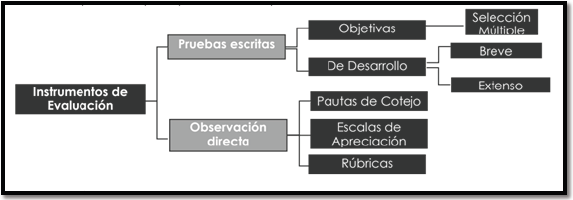 Instrumento de evaluación: Herramienta que contempla los criterios de evaluación y los indicadores de la tarea que debe realizar el estudiante que permite emitir un juicio sobre su desempeño. II. Clasificación de instrumentos de evaluación: Tradicionalmente, la elaboración de instrumentos se evaluación se basa en dos áreas, por un lado, aquellas clasificadas como pruebas escritas y, por otro lado, aquellas clasificadas como observación directa. Siendo el uso, propósito, información que reporta, estructura interna, entre otras, razones de su distinta clasificación. Metodológicamente utilizaremos el presente esquema para orientar la explicación de cada instrumento.