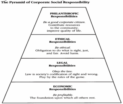 Carroll (1991) sitúa en la base de la pirámide la responsabilidad económica que se fundamenta en la noción de beneficios máximos, ya que, sin ella los demás componentes se vuelven irrelevantes. Después y coexistiendo con ésta, ubica la responsabilidad legal porque se espera que las empresas continúen sus misiones económicas en el marco de la ley, es decir, cumplan con las regulaciones nacionales y locales como las codificaciones de la sociedad del comportamiento aceptable e inaceptable. Sigue con la responsabilidad ética, que en interacción dinámica con la responsabilidad legal, refleja la obligación de hacer lo que la sociedad tácitamente cree que es correcto, justo y equitativo, y evitar o minimizar el daño a las partes interesadas: empleados, consumidores, ambiente, entre otras. Y en la cúspide, pone la guinda del pastel, la responsabilidad filantrópica , que abarca las acciones discrecionales3 que responden a las expectativas de la sociedad de que las empresas sean buenas ciudadanas corporativas, aportando recursos financieros y humanos a la comunidad y promoviendo el bienestar de todos.