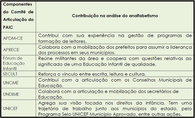 O PAIC mantém um Comitê de Articulação com funções consultivas, composto por: Associação para o Desenvolvimento dos Municípios do Estado do Ceará (APDM-CE), Associação dos Municípios e Prefeitos do Estado do Ceará (APRECE), Fórum de Educação Infantil, Secretaria de Estado da Cultura do Ceará (SECULT), União dos Dirigentes Municipais de Educação do Ceará (UNDIME-CE), União Nacional dos Conselhos Municipais de Educação (UNCME) e UNICEF. Cada um com sua contribuição na análise sistêmica do problema do analfabetismo escolar (CEARÁ, 2011; GUSMÃO; RIBEIRO, 2011).