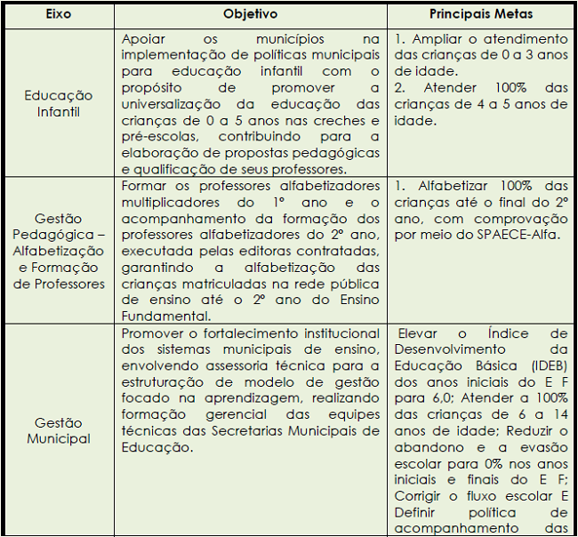 Em 2007, reconhecido como um programa com foco na gestão voltada à aprendizagem do aluno e da gestão escolar, o governo do Ceará transformou o referido programa em política pública (CEARÁ, 2012). Nessa perspectiva, de acordo com a Lei nº 14.026/2007, o PAIC foi estruturado em cinco eixos de trabalho: I - Educação Infantil; II - Gestão Pedagógica - Alfabetização e Formação de Professores; III - Gestão da Educação Municipal; IV - Formação do Leitor e V - Avaliação Externa de Aprendizagem.