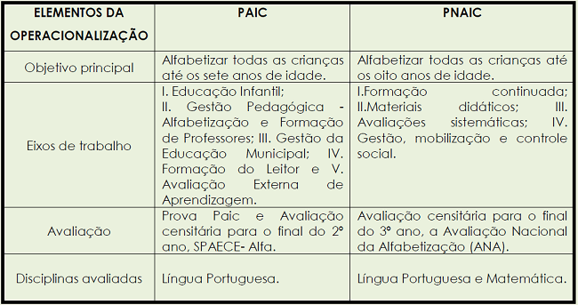 O PNAIC apresenta o objetivo de assegurar a alfabetização de todas as crianças, até os oito anos de idade, ao final do 3º ano do E F. A exemplo do PAIC, o PNAIC também traz uma avaliação censitária para o final do 3º ano, onde todos os alunos farão a Avaliação Nacional da Alfabetização (ANA). Também há diferença nas disciplinas avaliadas. Enquanto o SPAECE-Alfa avalia apenas Língua Portuguesa, a ANA avalia, além dessa, a disciplina de Matemática.