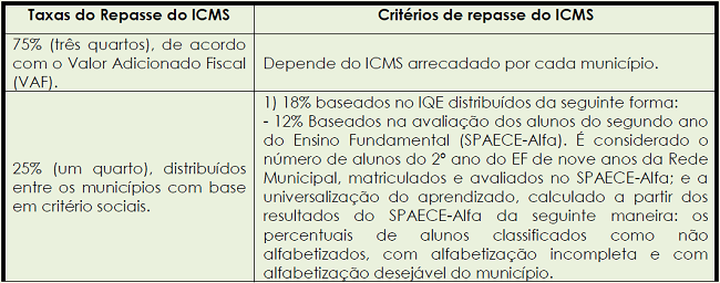 Segundo a cartilha de esclarecimento do IPECE (2011), a ordem da relevância das variáveis na cota-parte do ICMS é: primeiro, a Avaliação de Alfabetização (SPAECE-Alfa); segundo, as Avaliações Padronizadas (SPAECE e Prova Brasil); em terceiro, a taxa de aprovação no EF; em quarto lugar, a taxa de mortalidade infantil; e em quinto, os itens relativos ao meio ambiente.