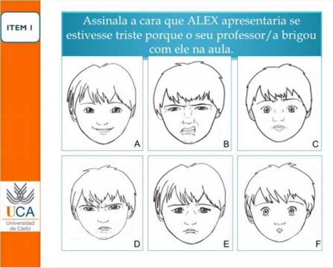 Dos 16 itens apresentados, oito correspondem à subescala de emoções básicas sendo solicitado às crianças que assinalem entre seis hipóteses (seis caras representando diferentes expressões faciais) em cada diapositivo, qual expressão teria a personagem (Alex) em determinada situação (itens: 1, 3, 5, 7, 9, 11, 13, 15) conforme exemplificado na figura 1. Isto é, a perceção da emoção corresponde à expressão facial que a personagem estaria a adotar numa situação concreta. A fiabilidade interjuízes (12 especialistas em emoções), correlações intraclasses, para os itens desta subescala, foi de 0.93 (MESTRE et al, 2011).