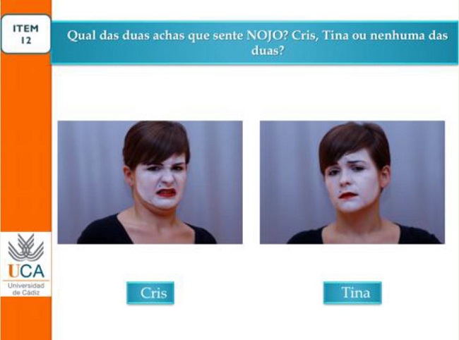 Os restantes oito itens procuram avaliar situações mais ambíguas para a criança, que num elenco de três respostas, tem de discriminar entre duas personagens idênticas (irmãs gémeas: Cris e Tina ou nenhuma das duas), qual das duas provavelmente está a sentir uma emoção ou nenhuma das duas (itens: 2, 4, 6, 8, 10, 12, 14, 16). Esta situação requer a perceção e depois a valorização e esforço da criança para discernir a resposta mais ajustada à questão colocada. A correlação intraclasse de 12 especialistas em emoções foi de 0,90 para os itens desta subescala (MESTRE et al, 2011). Os itens desenhados geram dois tipos de variáveis independentes: valorização de emoções; perceção e valorização de expressões faciais (figura 2). A correlação intraclasse de 12 especialistas em emoções foi de 0,90 para os itens desta subescala (MESTRE et al, 2011).