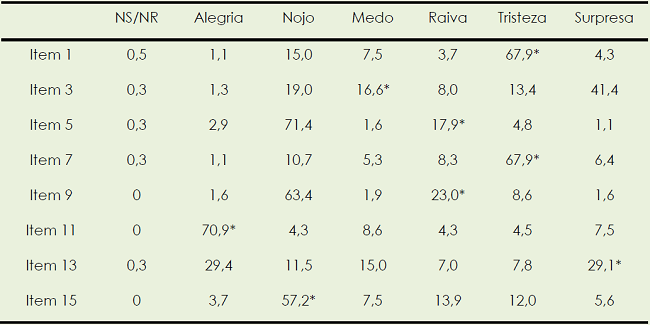 O objetivo inicial consiste em avaliar a capacidade de a criança em idade pré-escolar perceber e valorizar as emoções básicas (tabela 1). Os resultados indicam que as crianças em idade pré-escolar têm mais facilidade para perceber e identificar emoções como a alegria (70,90%) e a tristeza (67,90%), menos acertos no reconhecimento de emoções como a raiva (17,90% e 23%) e o medo (16,60%) e confusão relativamente a emoções como a raiva (17,9% e 23,0%) e o nojo (71,4% e 63,4%), e o medo (16,6%) e a surpresa (41,4%). Assim, a tabela 1 mostra a percentagem de respostas corretas de cada item na subescala “perceção de emoções básicas”.