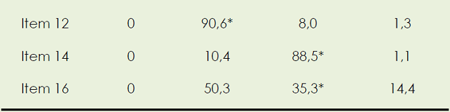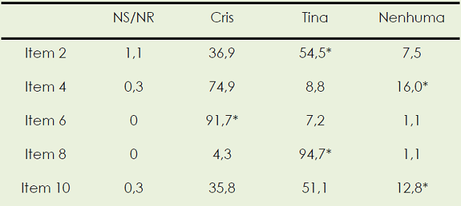 Pela observação da tabela 2 se depreende que a valorização das emoções obriga a um maior esforço cognitivo da criança uma vez que tem de comparar duas figuras com a possibilidade de que nenhuma corresponda às gémeas do item (item 10). As crianças apresentam maior facilidade quando a resposta correta corresponde a uma das personagens (Cris ou Tina) e o número de acertos é manifestamente menor quando a possibilidade que se ajusta à questão colocada é “nenhuma das duas”.