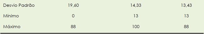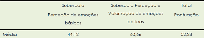 No que concerne à primeira subescala “perceção de emoções básicas”, podemos verificar a média foi de 44,12 (M= 44,12; DP= 19,60); a percentagem mínima foi 0 e a máximo foi 88. Em relação à segunda subescala “perceção e valorização de emoções básicas”, podemos observar a média foi de 60,66 (M= 60,66; DP= 14,33), apresentando um valor mínimo de 13 e um valor máximo de 100. Quanto à total pontuação, verifica-se uma média de 52,28 (M= 52,28; DP= 13,43), tendo a percentagem mínima 13 e a percentagem máxima 88.