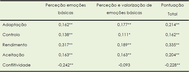 O coeficiente de correlações r de Pearson é utilizado para verificar a relação linear entre as variáveis critério (FORTIN, 2009; MARTINS, 2011) (as representações das educadoras de infância sobre os participantes) e as subescalas e a pontuação total da prova (tabela 5). Os resultados sugerem que a subescala perceção e expressão de emoções básicas se correlaciona significativamente com todas as variáveis critério, sendo positiva com a adaptação (r= 0,162), controlo (r= 0,138), rendimento (r= 0,317) e aceitação (r= 0,163) e negativa com a conflitividade (r= -0,242). A subescala perceção e valorização de emoções básicas correlaciona-se significativa e positivamente com a adaptação (r= 1,77), controlo (r=0,111), rendimento (r= 0,189) e aceitação (r= 0,163). A pontuação da prova total apresenta associação significativa e positiva com a adaptação (r= 0,214), controlo (r= 0,162), rendimento (r= 0,335) e aceitação (r= 0,204), e negativa com a conflitividade (r= -0,228). Isto é, a perceção e valorização das expressões emocionais primárias relacionam-se significativa e positivamente com as representações das educadoras de infância sobre o nível de adaptação do aluno à escola, o nível de controlo dos impulsos, o rendimento académico e a aceitação pelos pares. O coeficiente de correlação negativa significa que quanto maior for o nível de perceção, expressão e valorização das emoções, menor é o nível de conflitividade na idade pré-escolar.