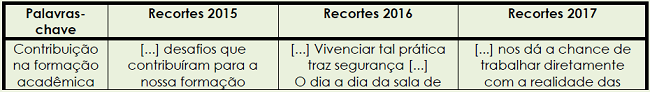 A partir do interesse de compreender as percepções dos estagiários que concluíram o ECS na EI, analisou-se um total de 28 relatórios produzidos nos anos de 2015 (8 relatórios), 2016 (9 relatórios) e 2017 (11 relatórios).