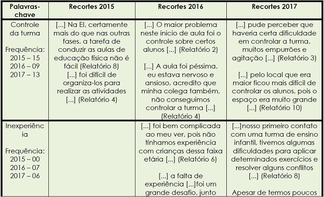 A semelhança das turmas de estágios (2015, 2016 e 2017) está nessas três palavras-chave, mesmo sendo de categorias diferentes acabam associando-se. A dificuldade em controlar a turma na maioria das afirmações foi associada ao comportamento das crianças, e nesse caso, a agitação é um dos fatores determinantes para a não realização ou reorganização das aulas dos estagiários. O descontrole da turma geralmente acontece pela indisciplina dos educandos ou pela insegurança do estagiário. Já a agitação, pode ser associada a falta de estímulos prazerosos para os estudantes, longo período de desenvolvimento da atividade, e também, atividades não adequadas para a faixa de idade das crianças.