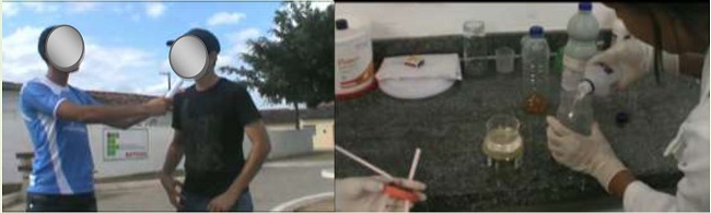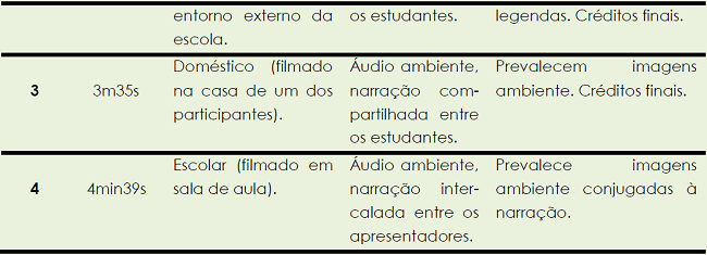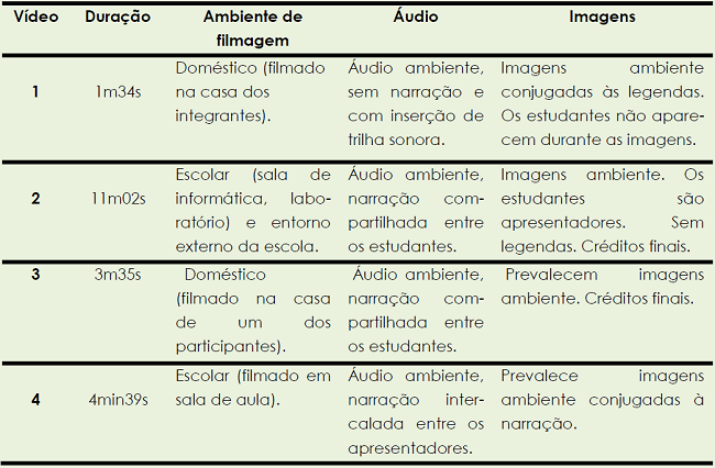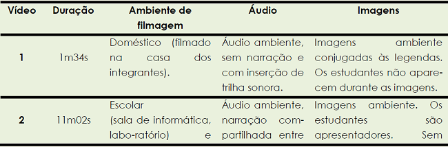 Em apenas um caso (vídeo 2) houve alternância de ambientes na mesma produção. Neste vídeo, os estudantes iniciam com um cenário de telejornal (ambiente interno – laboratório de informática), passam por ambiente externo (entorno da escola) e finalizam com a filmagem do experimento no laboratório didático da escola.