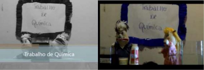 Também empregando a dramatização como recurso técnico-estético, no vídeo 3 os estudantes empregaram fantoches para a apresentação do experimento. O vídeo é iniciado com um plano dos bonecos em que a legenda e cartaz ao fundo indicam que se tratava de um trabalho escolar (Figura 4). A câmera é posicionada de forma fixa e frontal em todo o vídeo.