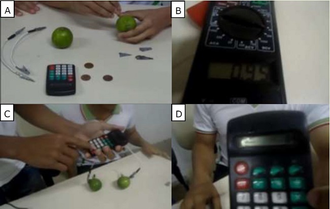 Em seguida, são relatados e demonstrados os procedimentos experimentais (a montagem da pilha, a medida do potencial e seu emprego para o funcionamento de uma calculadora), conforme sequência de imagens mostradas na Figura 5. Há efeitos de aproximação (zoom) para destacar etapas da montagem. A tomada é frontal e a câmera está fixa (Figura 5A). Na demonstração do funcionamento dos equipamentos a câmera está na mão e posicionada na diagonal (Figura 5C), também há aproximação para dar destaque ao funcionamento da calculadora (Figura 5D). Ao fim os estudantes destacam o uso de materiais simples e facilmente encontrados no dia-a-dia, com destaque que, além de funcionar para o experimento, o limão pode ser posteriormente consumido.