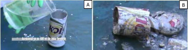 Este vídeo se diferencia dos demais por não apresentar características de humor. O curto tempo de duração e o foco na dimensão prática permite interpretar que a preocupação central está em mostrar o experimento, cujo destinatário principal seria a professora, uma vez que o vídeo consistia de uma atividade avaliativa. A preocupação em explicitar que se tratava de uma reação de oxidação-redução é evidenciada por legendas. A escolha de um experimento envolvendo explosão pode remeter à atração estética que este tipo de reação provoca nos jovens, uma visão de química geralmente associada a reações espetaculares tais como explosões, ideias muitas vezes reforçada pelos meios de comunicação. De fato, a escolha deste experimento pelo grupo foi pautada no efeito produzido na latinha de alumínio (Figura 6B), como revelou um dos estudantes por meio do questionário.