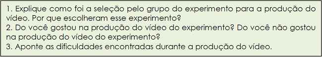 Assumindo a insuficiência de uma análise que retrata somente o produto final, deve-se considerar a investigação do processo de produção. Como forma de triangulação dos dados, os estudantes participantes responderam individualmente um questionário (Quadro 1) cujo intuito foi levantar informações sobre a escolha dos experimentos, aspectos positivos e negativos, além das dificuldades.