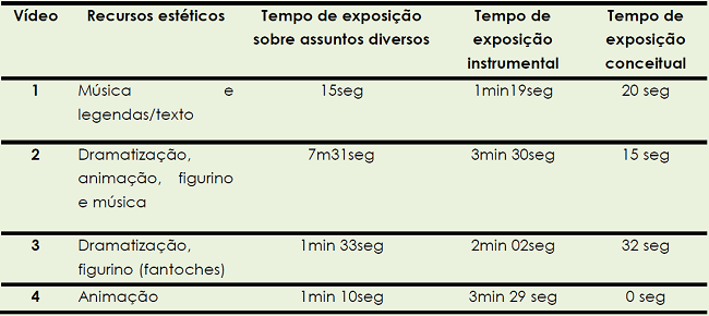A duração dos vídeos apresentou pouca uniformidade (Tabela 2), o que pode ser atribuído à inserção de elementos estético-culturais variados. O vídeo de maior duração abarcou questões sociais em maior amplitude, fator que elevou o tempo.