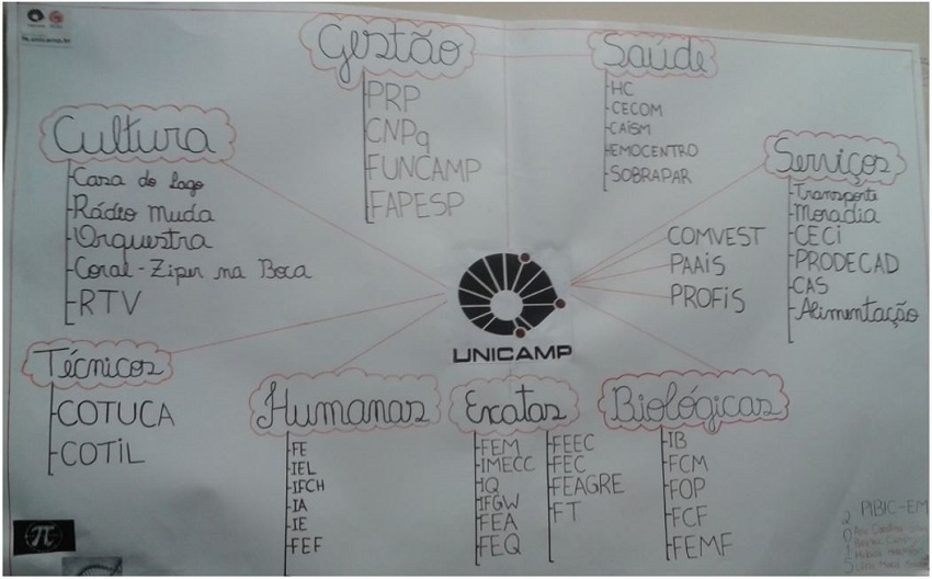 Ao final do mês de agosto, com o fim das visitas, os estudantes foram incentivados a refletir sobre a organização e a proposta da Universidade através de conversas que evidenciaram suas expectativas com a UNICAMP. Para encerrar essa primeira atividade eles produziram um mapa mental representativo no qual apresentaram a Universidade levando-se em conta tudo o que para eles foi significativo: