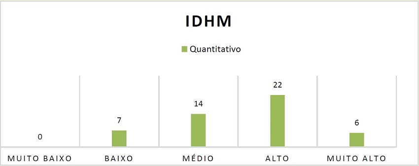 Com relação ao IDHM que é classificado em muito baixo (de 0 a 0,499), baixo (de 0,500 a 0,599), médio (de 0,600 a 0,699), alto (de 0,700 a 0,799) e muito alto (de 0,800 a 1), considerando o IDHM 2015, temos municípios com IDHM de baixo a muito alto, sendo que a maioria (28 municípios) encontram-se na faixa de alto e muito alto, vide gráfico: