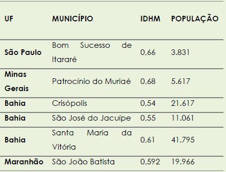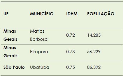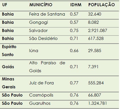 Com base nos dados apresentados nas tabelas e gráficos acima, observa-se que considerando a população, o IDHM e a divisão por regiões brasileiras, há uma grande diversidade no perfil dos 49 municípios apresentados. Tal perfil engloba municípios grandes e pequenos, com IDHM alto e baixo e que compõem as regiões mais desenvolvidas e menos desenvolvidas economicamente.