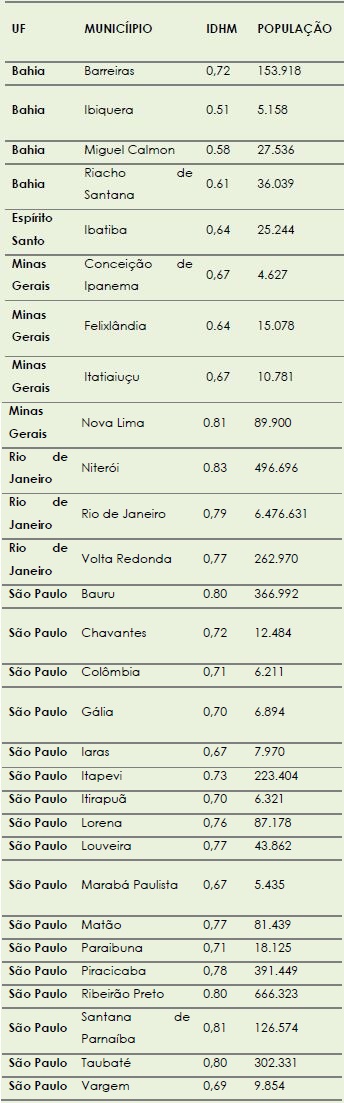 Os dados coletados nos permitiram as seguintes considerações: quanto à primeira variável encontramos municípios considerados de pequeno, médio e grande porte, segundo classificação do IBGE; quanto à variável Índice de Desenvolvimento Humano Municipal (IDHM), dentre as cinco classificações possíveis: muito baixo, baixo, médio, alto e muito alto, foi possível observar que nenhum dos municípios estudados se encontra na classificação “muito baixo” e todos os demais estão distribuídos entre as quatro classificações assinaladas (entre alto, médio e muito alto).