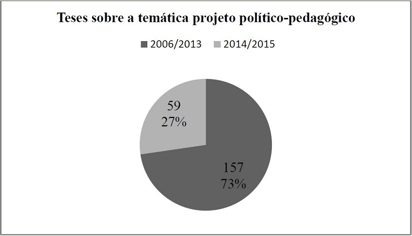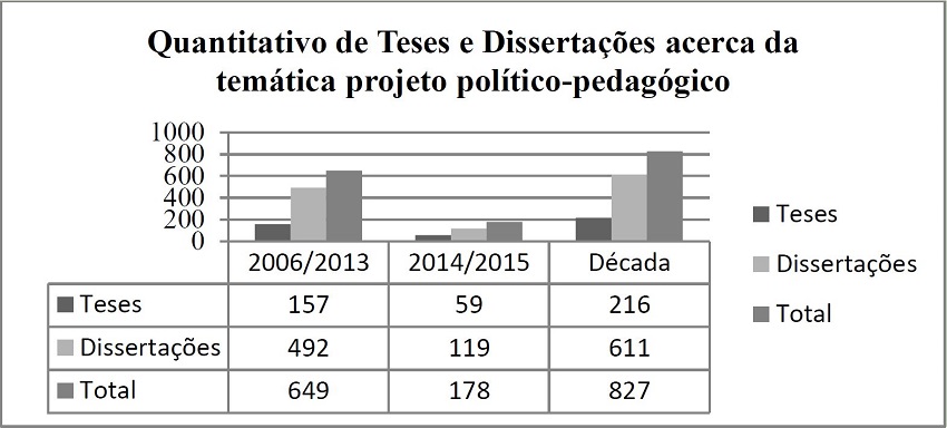Esta etapa do trabalho pretende considerar dois aspectos referentes ao projeto político-pedagógico: o primeiro se destina a recuperar o quantitativo de produções acadêmicas realizadas por meio de teses e dissertações (acesso em 15 de março de 2016) na década de 2006/2015, numa comparação com seu último biênio 2014/2015, que resulta em ponderar a respeito da atualidade do tema, demonstrando o constante envolvimento dos pesquisadores. O outro aspecto o qual evidenciaremos é uma fundamentação teórica sobre o assunto e um diálogo a partir da prática vivenciada junto a rede municipal de educação de uma cidade da região metropolitana Vale do Paraíba, no estado de São Paulo.