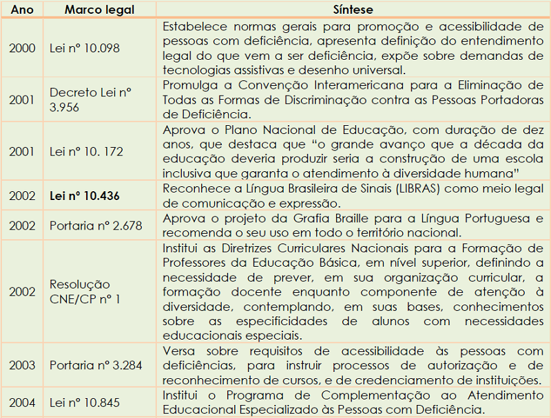 Em termos de bases legais no campo da educação especial, enquanto na década de 1990 tem-se os principais marcos políticos e concepções instituídos, a primeira década dos anos 2000, para além dos referendos expostos, apresenta diversas frentes de direitos no campo educacional, conforme se apresenta no quadro 1.