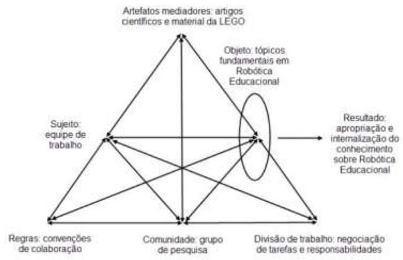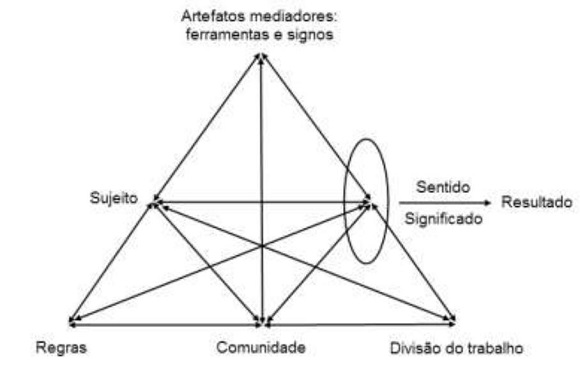 Com a finalidade de desenvolver a Teoria da Atividade, Engeström expandiu o esquema triangular da atividade de Vigotski (sujeito – artefato mediador – objeto). A expansão da representação triangular da ação de Vigotski buscou representar os componentes sociais/coletivos, adicionando elementos tais como comunidade, regras e divisão do trabalho, além de destacar a importância das interações entre eles. Esse esquema é representado na Figura 1, mostrando como o sujeito age sobre o objeto de maneira a transformá-lo usando artefatos mediadores a fim de obter os resultados específicos. Por sua vez, a posição do sujeito é influenciada pelas regras do sistema, pela sua comunidade e pela divisão do trabalho.