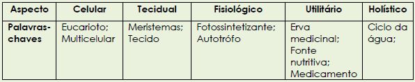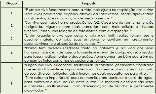 A definição global traz assim, mais uma vez, aspectos utilitaristas, celulares, teciduais, fisiológicos e holísticos das plantas. Observamos ao longo das respostas um acúmulo das proposições iniciais dos estudantes, que reverberam na construção em grupo.