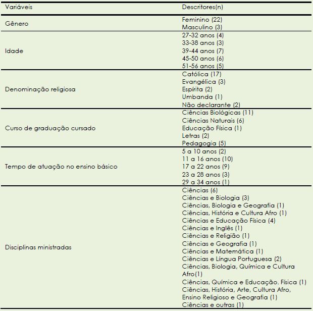 Os resultados da análise dos 25 questionários demonstrou que a maioria dos docentes pertence ao gênero feminino (22), com idade entre 27 e 56 anos. A denominação religiosa predominante entre os professores foi a católica (17) seguida pela evangélica (3) e em menor frequência estão as denominações espírita (2); e umbanda. Adicionalmente 2 entrevistados não declararam possuir qualquer denominação religiosa.