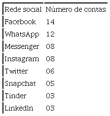 Dentre as redes sociais mais visitadas estão: o Facebook, seguido pelo Whatsapp, posteriormente, o Instagram e o Messenger. Outras redes como o Snapchat, Twitter, Tinder e Linkedln também são utilizadas pelos jovens, mas com menor frequência, como se observa no quadro 1, que mostra as redes sociais mais acessadas pelos jovens:
