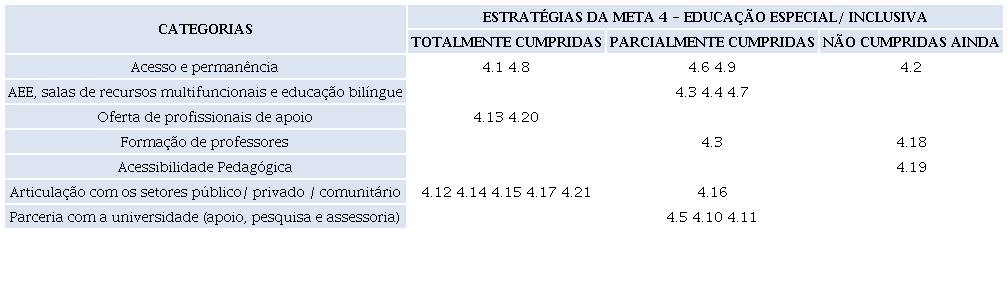 A primeira avaliação do PME aconteceu, como já citamos, em 2017, por uma equipe composta por representes da Secretaria Municipal de Educação e Cultura (SEMEC), professores, responsáveis pelo CAEE, professores representantes do Conselho Municipal de Educação, dentre outros. Após esse período, montou-se uma comissão que continua reunindose regularmente para novas avaliações. Com base em dados coletados na SEMEC, elaboramos o Quadro 1, com o intuito de apresentar uma visão sobre o cumprimento da Meta 4/PME. Para tanto, elegemos categorias de conteúdo e dividimos as 21 estratégias que compõem a meta em: totalmente cumpridas, parcialmente cumpridas e não cumpridas ainda.