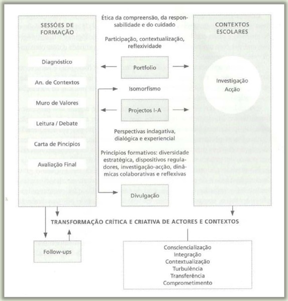 No modelo pode-se identificar uma estreita proximidade na relação teoria e prática, intermediada pelo método de investigação-ação, que de acordo com a autora, “não dispensam, antes exigem, reflexão, experienciação, debate, observação e colaboração”. (FEIO, 2015, p.447). Na formação apresentada sugeriu ainda a participação de um moderador, que interviria na superação de práticas, costumes, hábitos, padrões convencionados, quer fosse na escola ou no cotidiano profissional do professorado. Ainda segundo Feio (2015), o respectivo modelo teria de levar em conta: