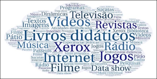 Ao analisar a nuvem de palavras foi possível observar que algumas palavras se destacaram em relação às demais, ou seja, foram as mais citadas pelas professoras, como, “livros didáticos”, “xerox”, “vídeos”, “internet” e “jogos”. Durante a elaboração da nuvem de palavras verificouse que as professoras citaram sempre a utilização dos livros didáticos como recurso, mostrando que o livro ainda é a principal fonte de informações por parte dos professores.