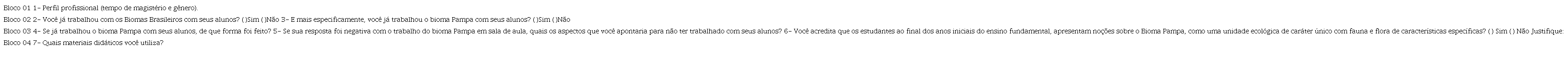 As questões foram agrupadas em quatro blocos, sendo o bloco 01 apresenta o perfil profissional geral dos entrevistados, o bloco 02 apresenta duas questões fechadas sobre os biomas, e no bloco 03 agrupou-se as três questões sobre a abordagem do bioma Pampa, e por fim, o bloco 04 sobre os materiais didáticos utilizados pelos professores, conforme o quadro(01) abaixo.