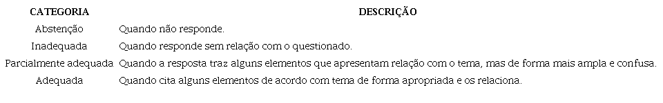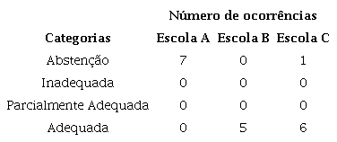 As respostas obtidas pelas professoras da escola B foram agrupadas na categoria “abstenção”, pois não responderam ao questionamento. Nas respostas da escola C, observa-se que seis respostas foram agrupadas na categoria “abstenção” e uma na categoria “adequada”, conforme a resposta abaixo: