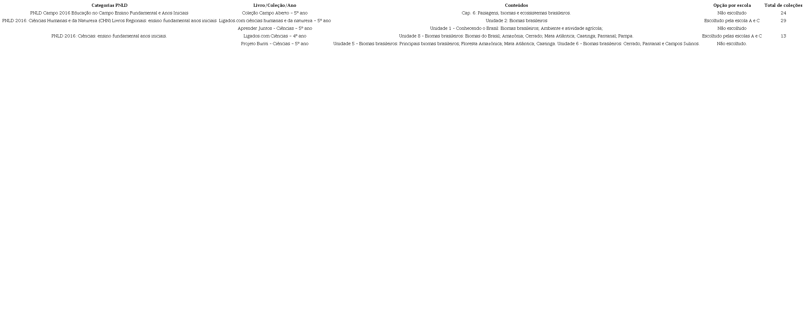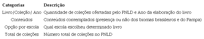 Considerando o livro didático como um dos recursos didáticos mais utilizados pelos professores no processo de ensino e aprendizagem na educação básica (BEZERRA; SUESS, 2013), foram analisados os livros do Programa Nacional do Livro Didático (PNLD), referente ao ano de 2016, a fim de verificar a abordagem do tema bioma Pampa neste importante recurso pedagógico.
