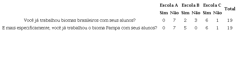 Destaca-se que, quando analisadas as escolas de forma individual, observa-se que a escola A, situada na área urbana de Jaguari, é a que menos aborda a temática investigada, onde as respostas revelam que os professores trabalham apenas questões do relevo do RS, mas de forma geral, sem relacionar com o Pampa.