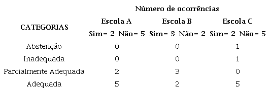 Quanto a análise da tabela (02), verificou-se que na escola A, todas as professoras investigadas não responderam à questão, por isso obteve-se um total de sete respostas na categoria “abstenção”.