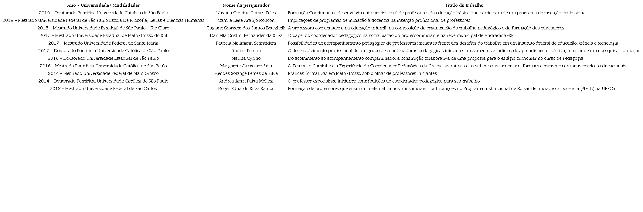 A pesquisa de doutorado de Pereira O desenvolvimento profissional de um grupo de coordenadoras pedagógicas iniciantes: movimentos e indícios de aprendizagem coletiva, a partir de uma pesquisa-formação, realizada na PUC em 2017, investigou um grupo de coordenadoras pedagógicas iniciantes da rede municipal da Grande São Paulo, com o objetivo de elaborar e compor coletivamente uma proposta de formação e analisar o planejamento das ações formativas desse grupo (PEREIRA, 2017).