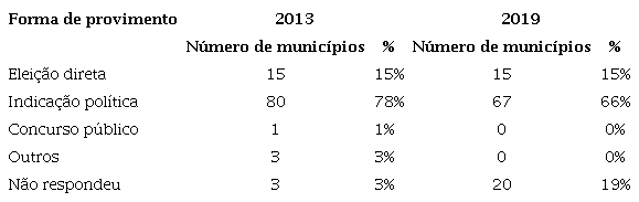 Os dados apresentados sobre a forma de provimento ao cargo de gestor escolar em Alagoas evidenciam a urgência de formas mais democráticas de escolha do gestor máximo das escolas no estado. Nos resultados, não foi destacado o concurso público como forma de provimento (em 2013, um município utilizava o concurso e, nos dias atuais, esse mesmo município adotou a indicação política como forma de provimento). Durante as duas pesquisas (2013 e 2019), não houve registro sobre a adoção da lista tríplice. Importante destacar que, como 20 municípios (19%) consultados não responderam ao questionamento, pode haver outras formas de provimento que não foram identificadas e/ou um número ainda maior de indicações político-partidárias.