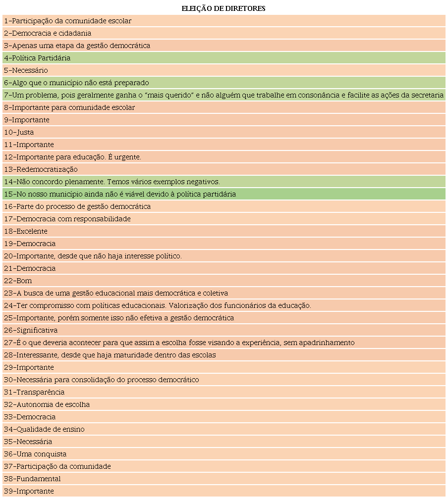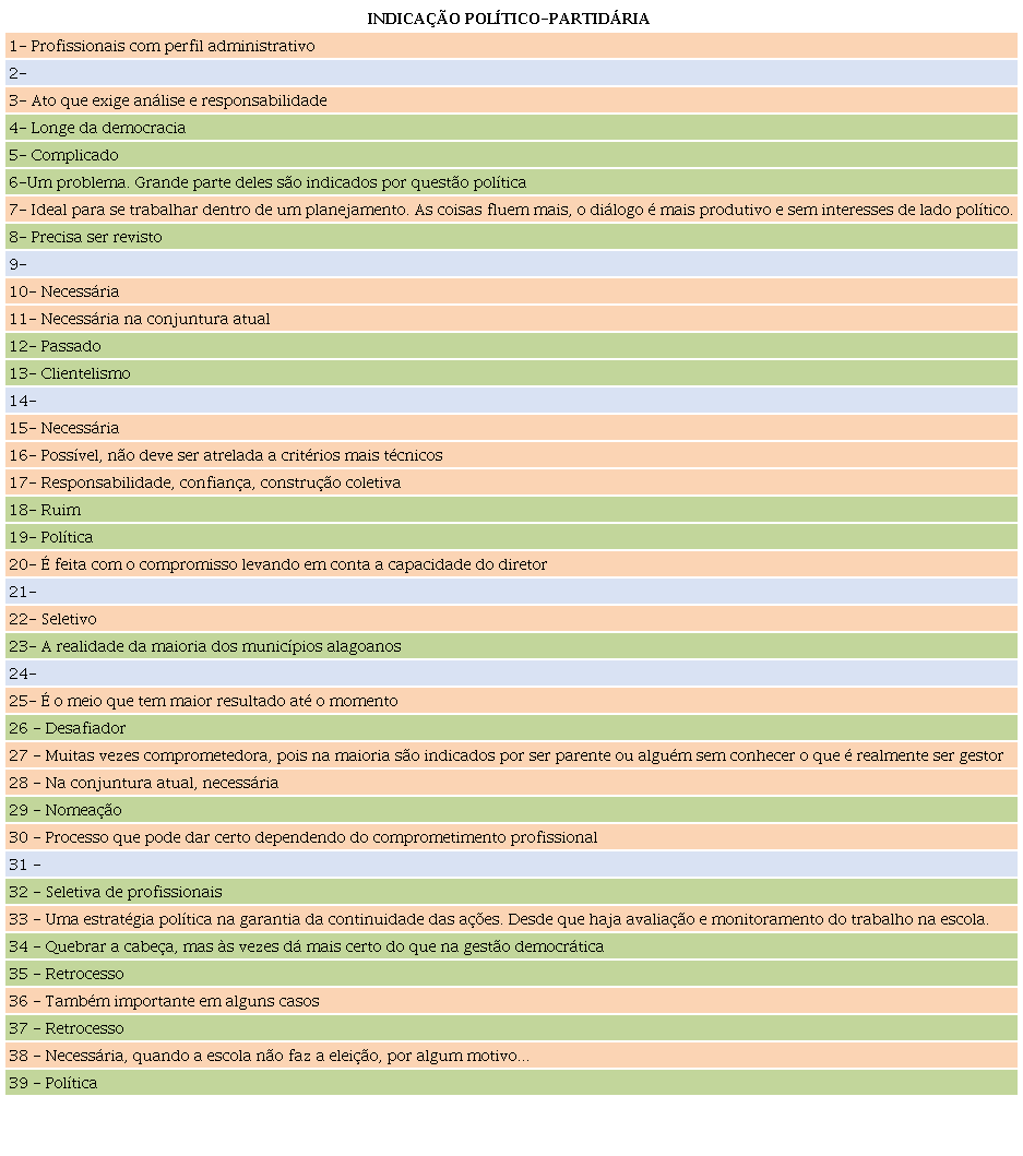 Os dados organizados no quadro anterior constatam que, dos 39 secretários, 17, representados na cor salmão, mostram um olhar positivo e afirmam que a indicação político-partidária é necessária, além disso, realçam que essa forma de provimento ao cargo do gestor escolar busca a garantia de ações continuadas na instituição de ensino. Diante disso, destacam-se os termos “confiança, responsabilidade, construção coletiva”, os quais são designados pelo apadrinhamento político, forte marca de uma sociedade clientelista e oligárquica, conforme mostra o estudo de Araújo (2007) sobre os desafios de uma gestão participativa em Alagoas.