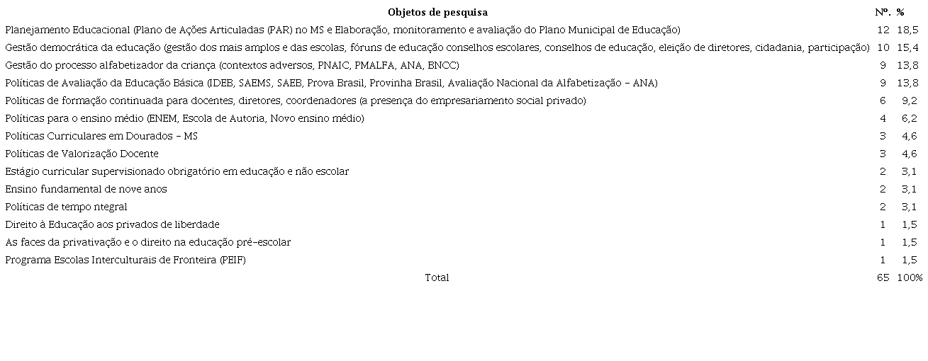 O objeto “Planejamento Educacional (Plano de Ações Articuladas (PAR) no MS e Elaboração, monitoramento e avaliação do Plano Municipal de Educação”, aparece em maior quantitativo nas produções com 18,5%, está entre os temas mais presentes nas investigações do PPGEdu que se debruça sobre as questões do planejamento educacional, decorrente da importância dessa temática para as políticas educacionais desta década, marcada pelas conferencias nacionais de educação com participação e incidência sobre os planos decenais de educação. Coforme aponta Dourado (2017, p. 26), a discussão e materialização do Plano Nacional de Educação