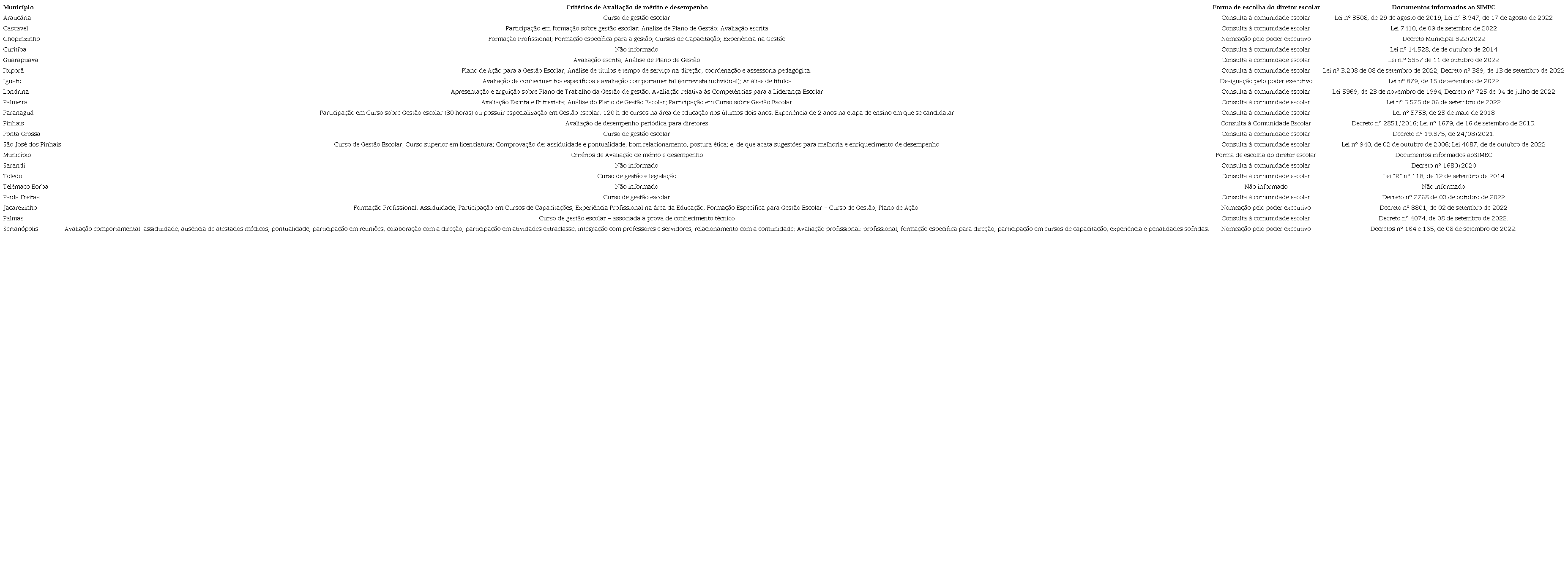 [...] nº do(s) artigo(s) que indique(em) os critérios técnicos de mérito e desempenho ou Nº(s) do(s) artigo(s) que indique(m) a consulta pública à comunidade escolar, precedida de análise dos critérios técnicos de mérito e desempenho (BRASIL, 2022a, p.2).