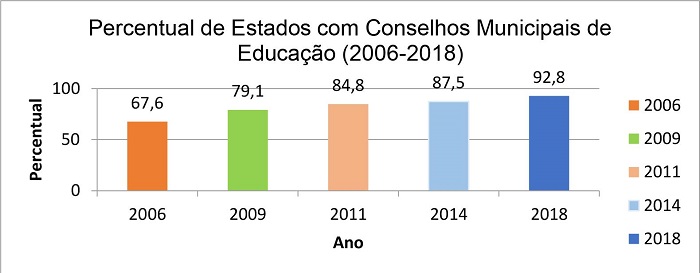 Conforme já pontuamos anteriormente, alguns Conselhos Municipais de Educação começaram a ser criados a partir de 1970, mas com a promulgação da CF de 1988 e da aprovação da LDBN em 1996 eles se ampliaram, mediante a prerrogativa legal prevista pelo artigo 211 da CF de 1988, que reconheceu a autonomia dos municípios e a existência dos Sistemas Municipais de Ensino (SME). Assim, deixaram de ter suas funções delegadas pelos Conselhos Estaduais de Educação e passaram a ter funções próprias relativas aos SME, de forma autônoma em seus espaços de atuação, porém articuladas aos Conselhos Estaduais de Educação.