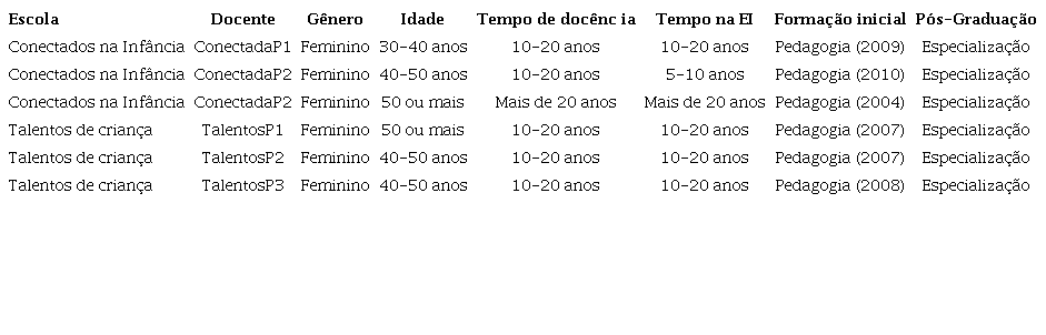 ConectadaP2 informou que participou de uma formação continuada voltada a um “uso muito técnico das tecnologias” e não direcionada ao uso pedagógico, conforme suas expectativas. Avaliou a formação como “um pouco produtiva” e afirmou que aprendeu apenas a editar alguns vídeos. Por sua vez, ConectadaP3 explicou que participou de duas formações continuadas sobre tecnologias: “foram de curto prazo e não atenderam minhas expectativas”. E, em seguida, fez a importante avaliação: “esperava que fossem voltadas para o uso pedagógico em sala de aula”. As colocações das três professoras desta escola vão ao encontro do que Castro (2020) vem defendendo sobre a falta de formação para o uso pedagógico - e não meramente técnico - das TE nos cursos de Pedagogia; e dos resultados da pesquisa de Castro e Silva (2021). A seguir, as respostas das professoras da escola Talentos de Criança:
