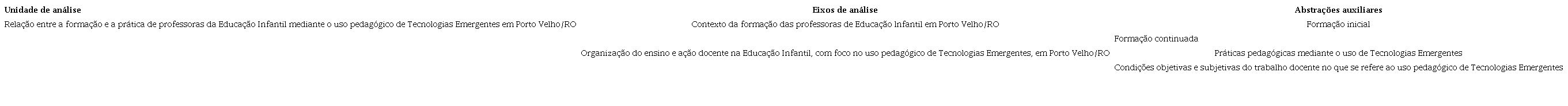 Com base nessa abordagem, foi definida a unidade de análise “Relação entre a formação e a prática de professoras da Educação Infantil mediante o uso pedagógico de Tecnologias Emergentes em Porto Velho/RO”. A partir da unidade de análise, foram concebidos dois eixos analíticos, sendo, cada um, constituído por duas abstrações auxiliares, de acordo com a organização do processo de análise dialética dos dados, conforme preconizado por Castro (2024), representado no Quadro 2: