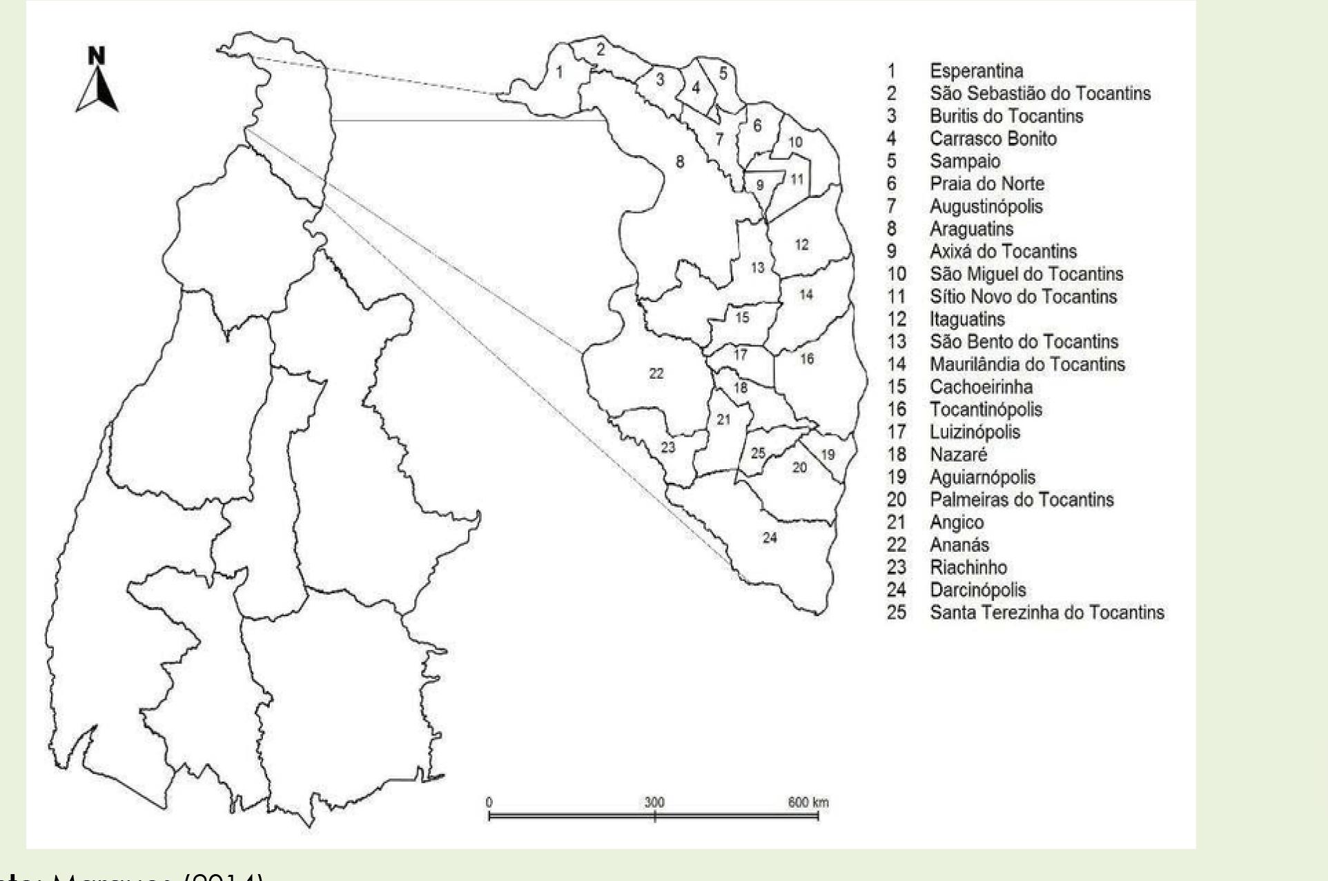 Conforme mencionado na sessão anterior, a área do objeto de estudo está na Microrregião do Bico do Papagaio, com extensão territorial de 15.993,20 km2, correspondendo a 5,75% do território do estado do Tocantins e constituída por 25 municípios. Segundo o Instituto Brasileiro de Geografia e Estatística (IBGE, 2010) registra-se uma população de 196.367 habitantes nesta região, o que representa 14% do total do Estado. Segue abaixo o mapa que representa as informações apresentadas.