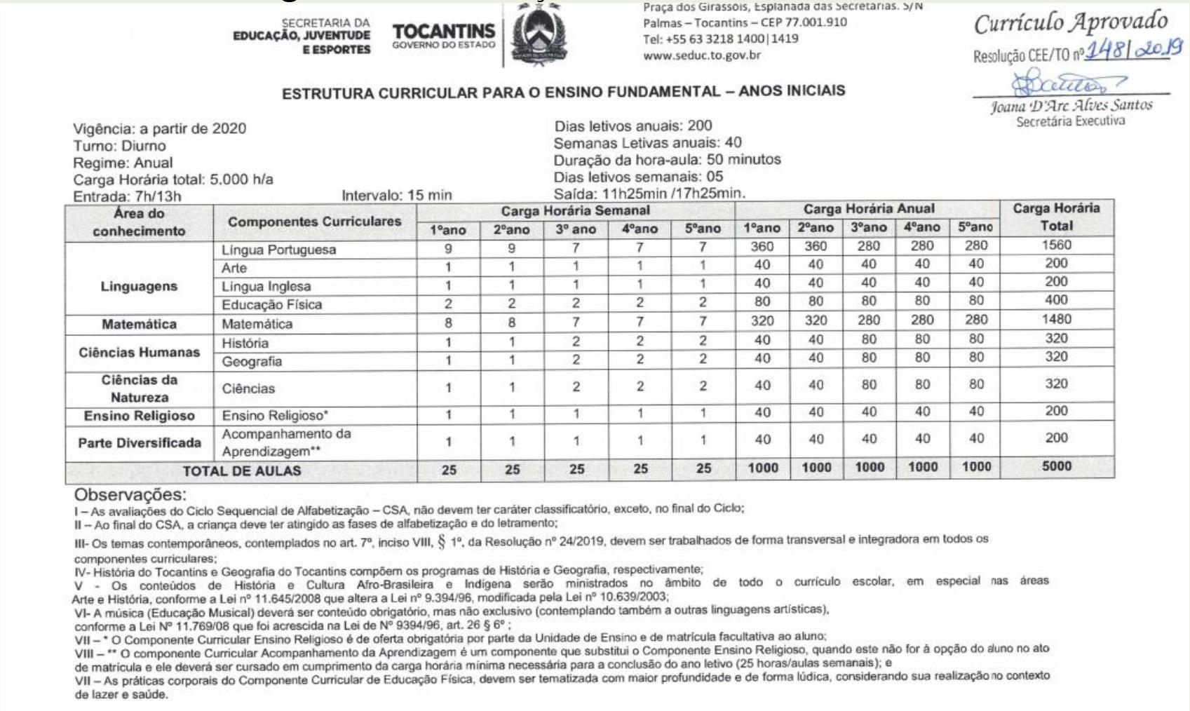 É importante salientar que, nas Unidades Escolares a estrutura curricular adotada para o Ensino Funamental Anos Iniciais é a mesma das escolas da rede estadual de ensino do Tocantins. A Resolução CEE/TO, nº 148/2019, que aprova o currículo da educação básica e suas modalidades, conforme está descrito no item V, (Tocantins, 2019, p. 4), informa que “Os conteúdos de História e Cultura Afro-Brasileira e indígena serão ministrados no âmbito de todo currículo escolar, em especial nas áreas de Arte e História, conforme a Lei nº 11.645/2008 que altera a Lei nº 9.394/96 e a Lei nº. 10.639/2003.”