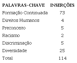 Nesta pesquisa, a escolha das unidades de registro levou em conta as características dos PPPs, bem como, identificar como são abordadas as questões étnico-raciais nestas escolas. Por isso, foram definidas as seguintes palavras-chave: formação continuada; direitos humanos; racismo; preconceito; discriminação; e diversidade. Na sequência, foi feita a contagem dessas palavras nos textos, através da ferramenta “localizar” disponível para realizar buscas nos arquivos digitais com extensão PDF. Subsequente, foi elaborada uma tabela com os elementos palavras-chave - inserções.