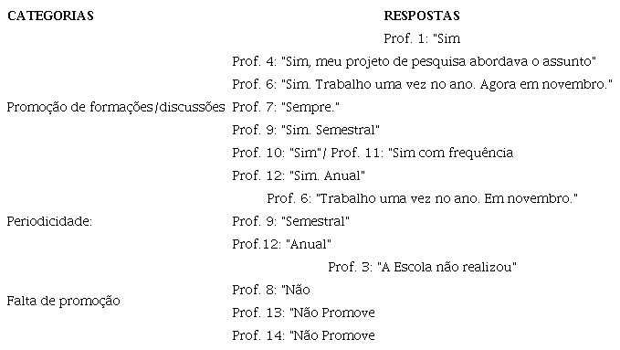 A primeira questão do questionário a ser analisada é “a Escola que você trabalha promove formações /discussões acerca das temáticas: etnia, racismo, preconceito e inclusão? Qual a frequência?” Consoante a perspectiva de Laurence Bardin (2011), foi possível categorizar as respostas e identificar categorias com base nas respostas dadas e agrupar as professoras em cada uma delas.